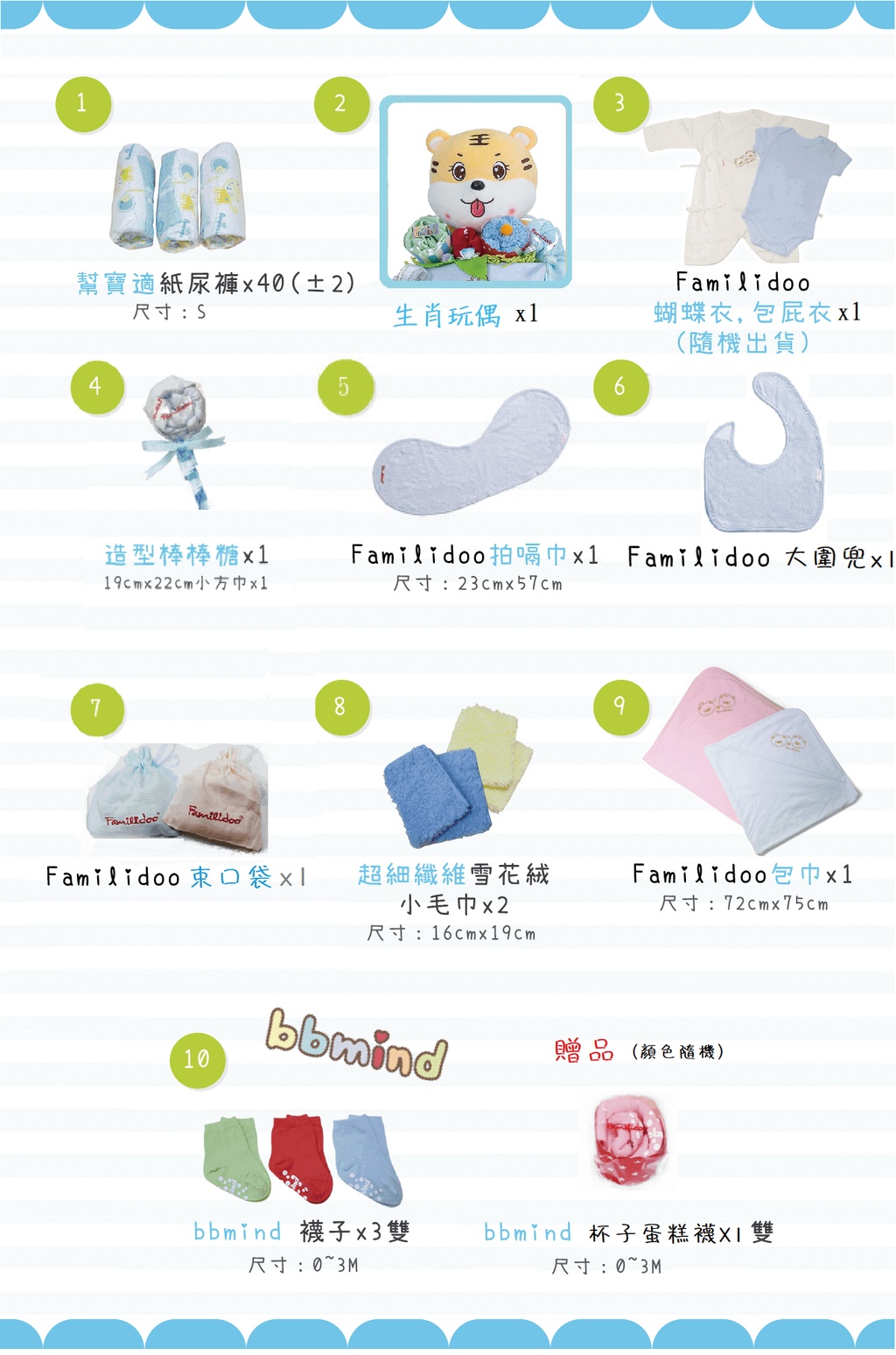 尿布蛋糕包含許多新生兒會用到的貼身衣物、多種實用性高用品。而這款老虎尿布蛋糕還有一種顏色喔!